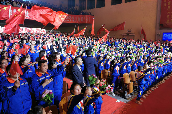 工人俱樂部大禮堂燈光璀璨,二樓眺臺(tái)懸掛著橫幅:“為把中國(guó)建材集團(tuán)打造成具有全球競(jìng)爭(zhēng)力的世界一流綜合性建材和新材料產(chǎn)業(yè)投資集團(tuán)而努力奮斗!”舞臺(tái)上,瑰麗的五星紅旗映照著高聳的預(yù)熱器,“永登高峰向前進(jìn),放歌祖國(guó)新時(shí)代”十四個(gè)金色大字熠熠生輝。
