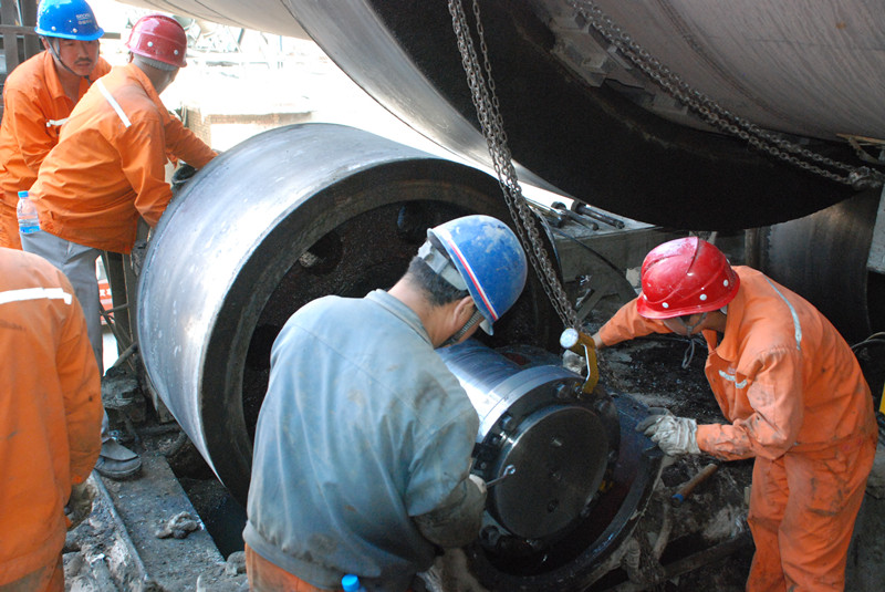 為提高設(shè)備的運(yùn)行質(zhì)量,確保低堿水泥的正常生產(chǎn),8月9日,天水公司熟料部對(duì)1號(hào)窯托輪進(jìn)行檢修。圖為檢修時(shí)的情景。( 張瑞華/報(bào)道)