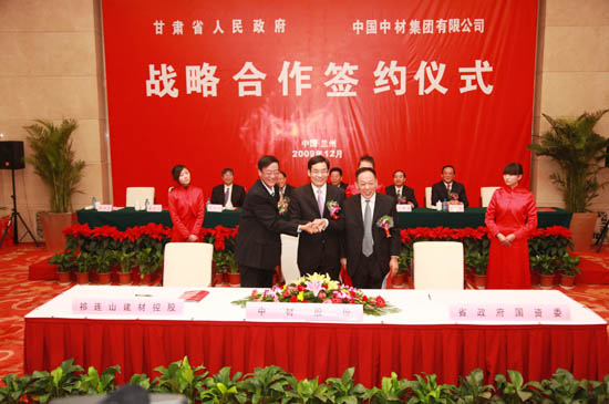周育先(中)、馬艾武(右)、楊皓代表中材集團(tuán)、甘肅省國資委、祁連山建材簽訂祁連山建材增資擴(kuò)股及股權(quán)轉(zhuǎn)讓協(xié)議