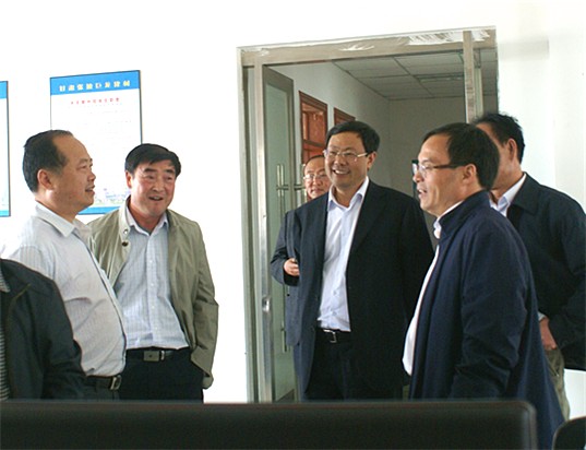 圖為脫利成一行在巨龍建材中控室參觀的情景