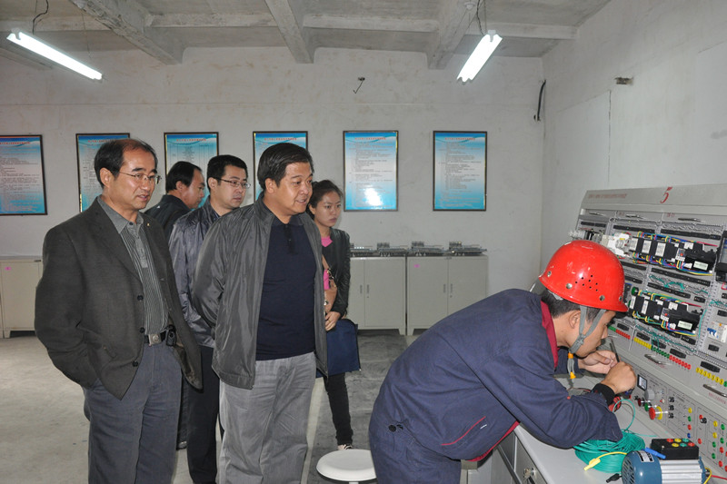 王育民一行到公司技術(shù)比武實(shí)際操作考試現(xiàn)場(chǎng)觀看比賽情況的情景。(孫光亮/攝)