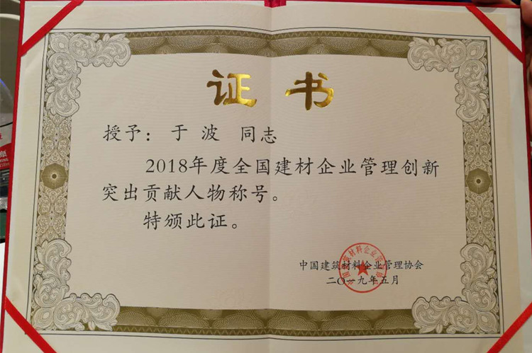 成縣公司黨委書記、總經(jīng)理于波被授予“2018年度全國建材企業(yè)管理創(chuàng)新突出貢獻(xiàn)人物”稱號