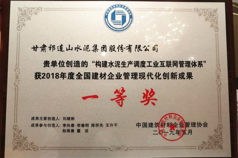 由股份公司總裁劉繼彬主創(chuàng)的《構(gòu)建水泥生產(chǎn)調(diào)度工業(yè)互聯(lián)網(wǎng)管理體系》榮獲2018年度全國建材企業(yè)管理現(xiàn)代化創(chuàng)新成果一等獎;股份公司副總裁、董事會秘書羅鴻基主創(chuàng)的《搭建新型電商平臺 重構(gòu)水泥企業(yè)營銷管理體系》、古浪公司總經(jīng)理李岳主創(chuàng)的《水泥企業(yè)信息化體系的構(gòu)建與應(yīng)用》、漳縣公司總經(jīng)理黃繼德、生產(chǎn)管理處高級主任工程師程俊生主創(chuàng)的《水泥窯智能優(yōu)化專家系統(tǒng)的開發(fā)與應(yīng)用》、成縣公司總經(jīng)理于波、安全環(huán)保處處長高建強(qiáng)主創(chuàng)的《以促進(jìn)企業(yè)全面發(fā)展為目標(biāo)的相關(guān)方安全管理模式構(gòu)建》榮獲2018年度全國建材企業(yè)管理現(xiàn)代化創(chuàng)新成果二等獎。成縣公司黨委書記、總經(jīng)理于波被授予“2018年度全國建材企業(yè)管理創(chuàng)新突出貢獻(xiàn)人物”稱號。
