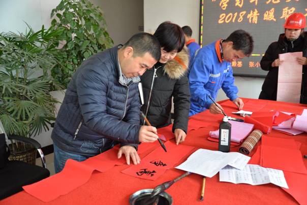 春節(jié)前夕,隴南、青海公司工會邀請當(dāng)?shù)睾凸緯◥酆谜邽槁毠ぜ覍贂鴮懘郝?lián)800余幅。圖為隴南公司書法愛好者為職工書寫春聯(lián)的情景。(孫光亮 王普∕報道)